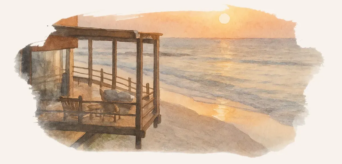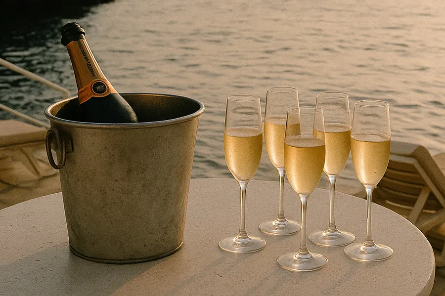 Una velada íntima junto al mar con champagne, vino, cocktails y un atardecer impresionante.